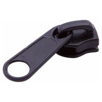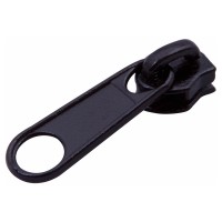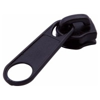 Enamel non-locking slider in black. Available in 4 1/2 mm, 5 mm, 7 mm, 8 mm, 9 mm, and 10mm sizes. Double pull also available, 9 mm.