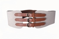 Taupe elastic webbing and leather belt, with three antique brass prong buckles. 2 1/4" wide webbing.