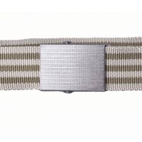 Nylon webbing belt with olive drab and tan stripes and antique nickel military buckle. 1 1/2" wide.