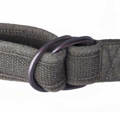 Olive drab cotton webbing belt with blackened copper d ring closure. 1 3/4" wide.