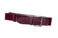 Maroon elastic webbing and leather belt with metal prong buckle and slide.